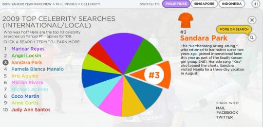 Yahoo! Philippines also ranks Sandara Park as third most searched, with sex scandal-embroiled Maricar Reyes at number one, and Emmy-nominated actress, Angel Locsin in second place.