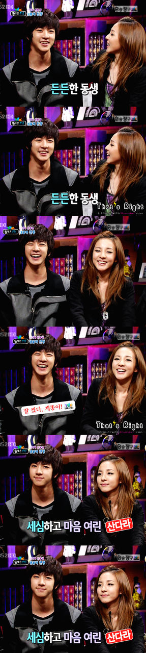 I love seeing them together! I really can’t put into words how I adore these siblings. So cute! And you will really see that Dara-unnie is fond of her little bro. ^_^ That little hug is just so adorable! Hehe. Thunder is so tall. XD