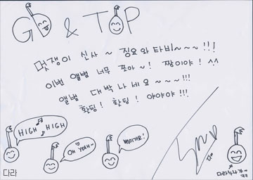 Dara’s Message to GD&TOP:  “cool boys, jingyo and tabi. i really like this album, may it come out daebak! hwaiting yayaya. – Dara Nuna”