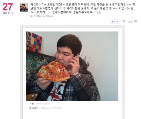 Glad your back in your Me2day dara. We were thinkin your’e gone updating to MeSometimes or MeSomeday and we wondering when you’ll get back. Finally you are here ^__^ Hey, i like the picture of your manager and his appatizer 🙂