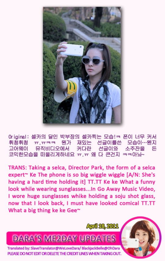 Dara’s definitely the undisputed Selca master the rest are just her copy cat..I love all the pics she always publish in her me2day their unique, entertaining and never boring. ^_^