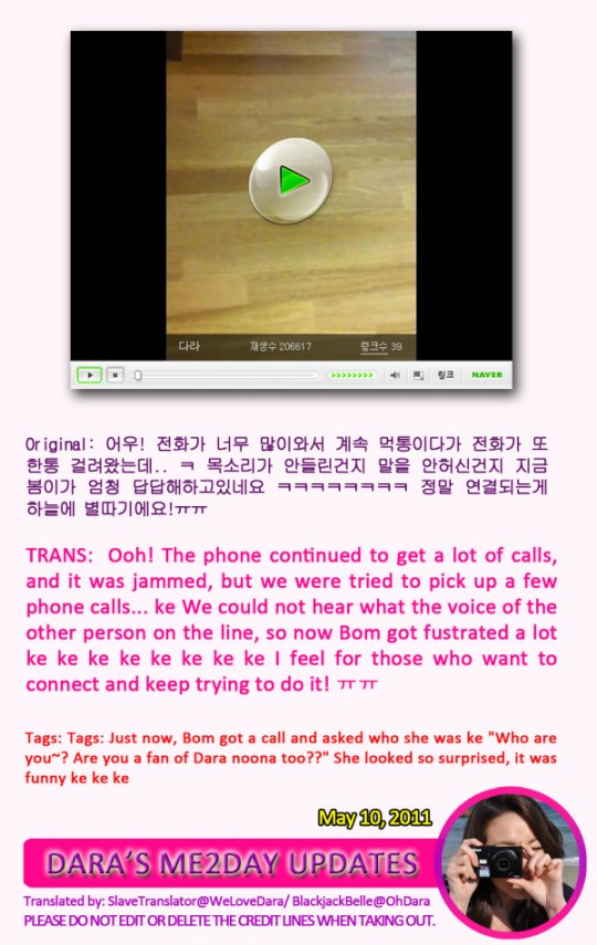 hahaha! the videos were so funny.. bommie’s yoboseo was a laughtrip.. haha.. i think the callers were not answering them that’s why bommie keeps on saying hello.. hahahah.. and i think minzy was the one recording on the other video.. i wonder what are they doing during that time.. kekeke! 2NE1 JJANG!!!