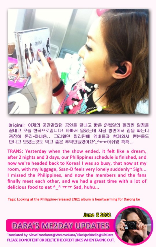 Park sisters are both cute in the 1st pic, I was smiling when I saw Dara’s hello kitty since I also like hello kitty stuff. Leader CL is cute holding her cake. It’s probably such a short visit for our girls but it sure was a memorable one for them and their fans – Filipino blackjacks. 2NE1 fighting!!!