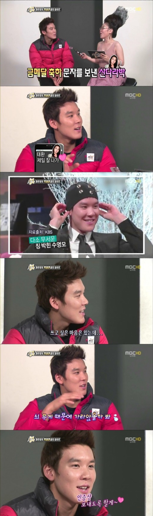 During her featuring, Sandara Park presented him with a spiked swimming cap, and when Taehwan was asked why he didn’t wear the cap during his the 2011 World Swimming Championships in Shanghai, he answered, “I really wanted to wear it, but because of the weight of the iron, I was afraid to sink,” he added, “But I’d wear it during practice and I’ll give you a confirmation shot,” she said, leaving a funny message for Sandara Park right after.