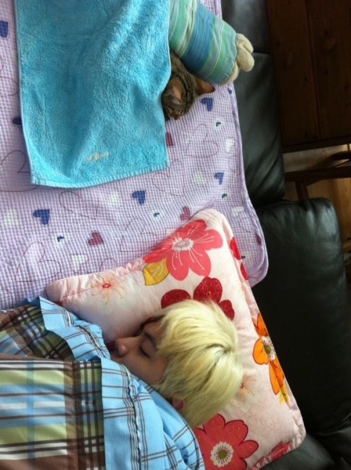 Lying together on the sofa~ Sleeping Cheondug&Dadung!!! These two babies never fail to make me smile ^_^ Nuna smile~! Ke Ever since dawn, I had to go out for my schedule, and I got so tired… *tired*tired* … ㅠ.ㅠ Ke ke ke So everytime I get tired or sleepy, I’l just look at this, and the day becomes more cheerful, and I feel happier! My two cute darlings~! Ke