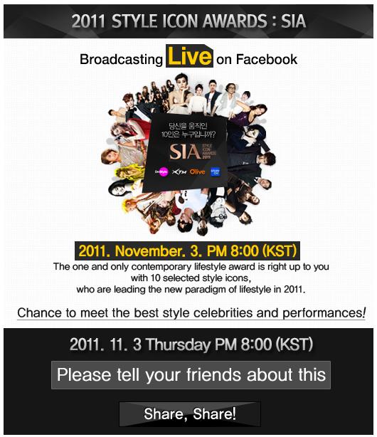The 2011 Style Icon Awards: SIA will be broadcasted live via Facebook on November 3, 2011 at 8:00PM KST.