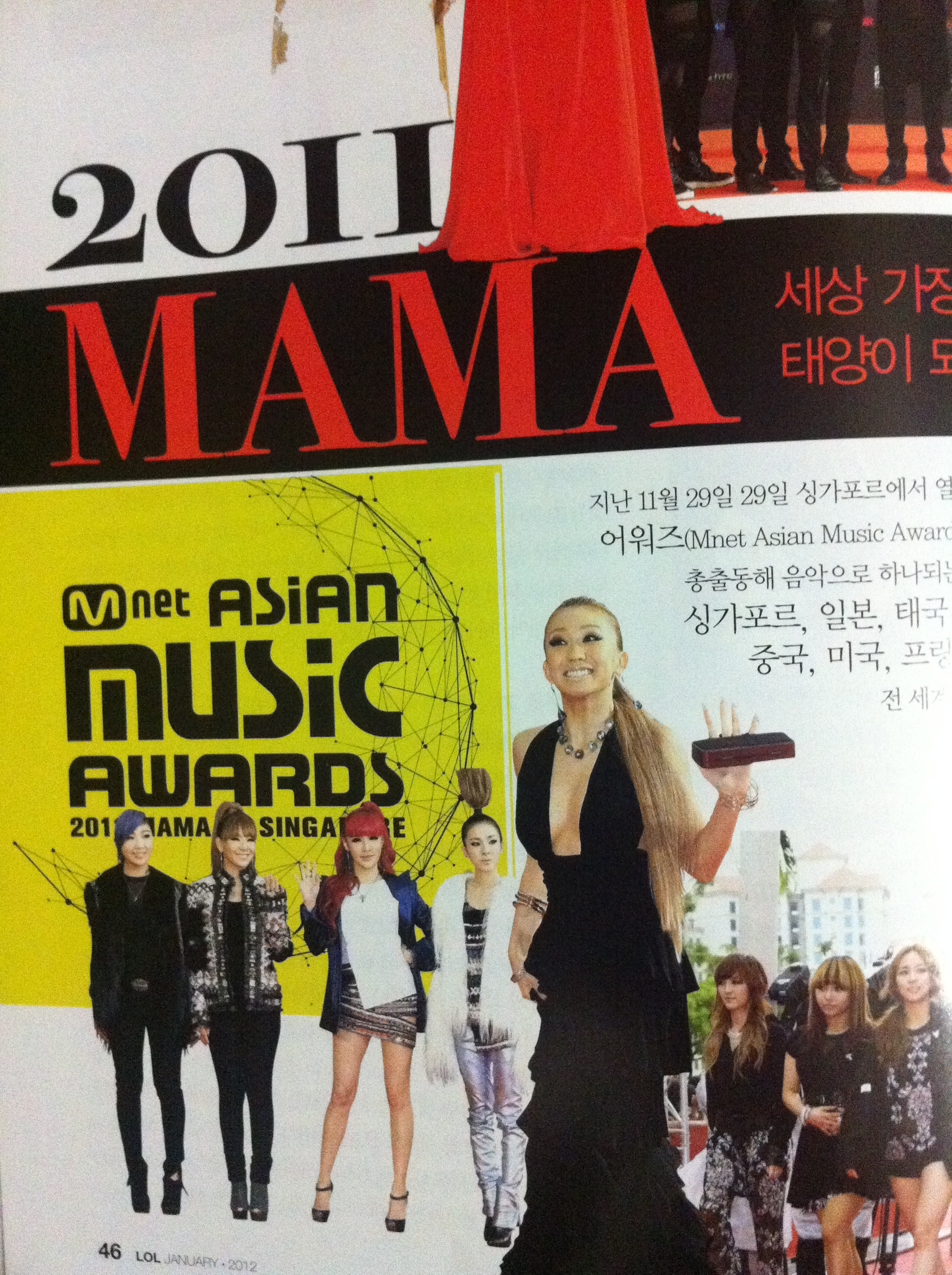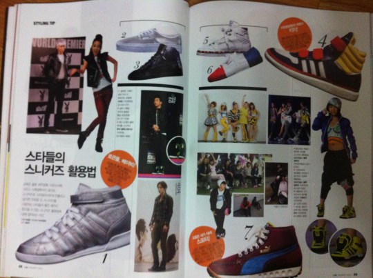 There’s also a short feature about footwear! See Dara in her hot KISS outfit for MAMA 2011, alongside TOP, on the left page! Then check out adorable Minzy in her PDG MAMA outfit and 2NE1 on the right!