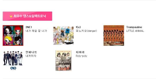 This year, 2NE1 is nominated in 2 categories for their song “I Am The Best” from their 2nd Mini Album. They are nominated for “Song of the Year” and “Best Dance and Electronic Song”. Other nominees for “Song of the Year” include IU for “Good Day”, Lee Seung Yeol for “Not Coming Back”, Metal and Wreckx for “Yes Yes Y’All”, “Chang Kiha & The Faces for “Another Relationship” and Cho Deok Hwan for “A Long Way Home”. Other nominees for “Best Dance and Electronic Song” include f(x) for “Danger”, Trampauline for “Little Animal”, Infinite for “Be Mine” and T-ara for “Roly Poly”.