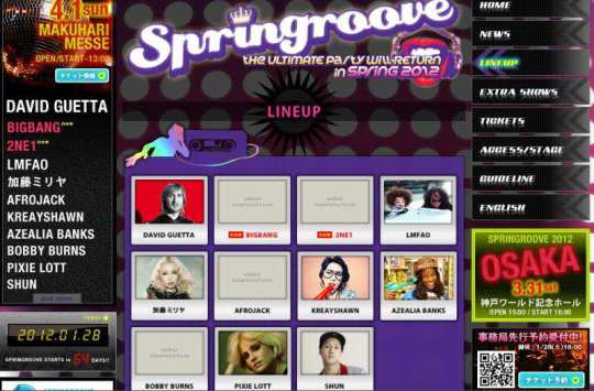 Big Bang and 2NE1 will stand on the same stage as LMFAO, who stormed the world with the shuffle dance, and electronic DJ David Guetta, who will also participate in the 2012 SPRINGROOVE.