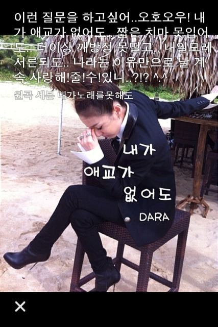 T/N: On the picture, he put Dara’s me2day update (the words at the top). On Dara’s original pic, the words on her suit are “Even if I can’t do aegyo..” Aegyo is acting cute in Korean.