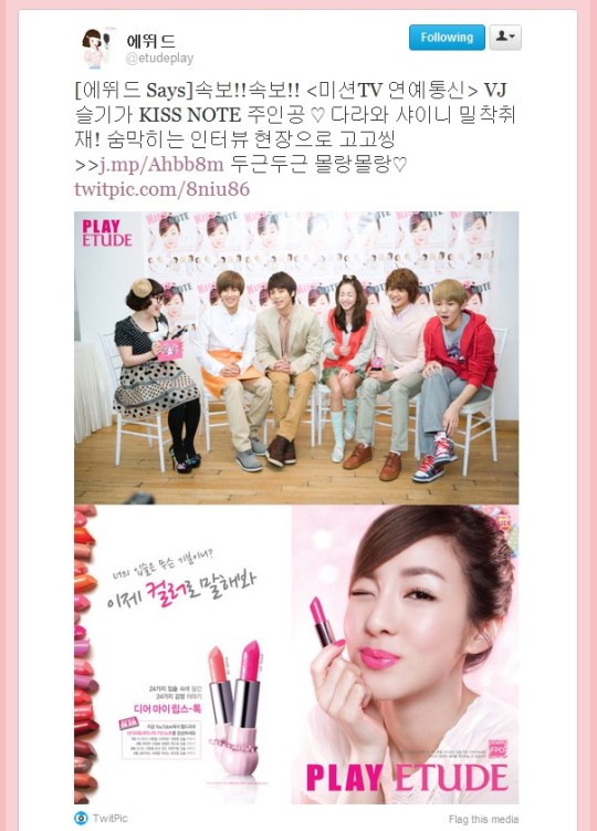 [TRANS][TWITTER @etudeplay ] Newsflash!! Newsflash!! <Mission TV Entertainment News> VJ Seulgi’s close coverage with Kiss Note’s cast ❤ Dara and SHINee! Go go go fast to see the exciting scenes at the interview site >> http://j.mp/Ahbb8m *thump thump* *heartbeat heartbeat*