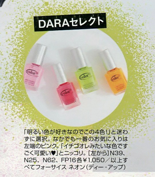 Favorite Nail Color: DARA’S CHOICE – I like the bright hues of these 4 colors! I chose these without hesitation. Among these, I like the pink one of the left-most side the most. “The color reminds me of strawberry au lait, it’s too cute ♡ “