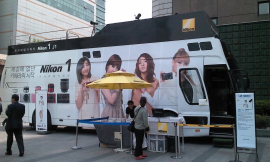 Nikon decided to upgrade their bus with new 2NE1 photos! ^_^ Love it! Check out the small Dara J1 standee at the side.