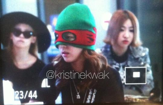 The girls are back in Seoul!  Now that they’re back, I hope that they could rest a bit.  Oh, and what do you think of Dara’s cute ninja turtle beanie? ^^
