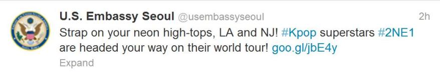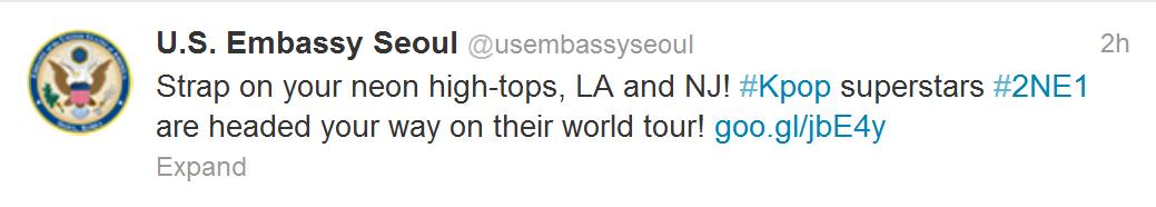 Twitter/Cap: U.S. Embassy Seoul – “…2NE1 are headed your way on their world tour!”