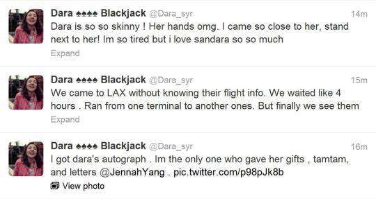 This is so cute! ^_^ @Dara_syr is so lucky to have met Dara at LAX! You can actually feel giddy while reading her tweets. She said that she was trembling and shaking while waiting for Dara at the airport! ^^