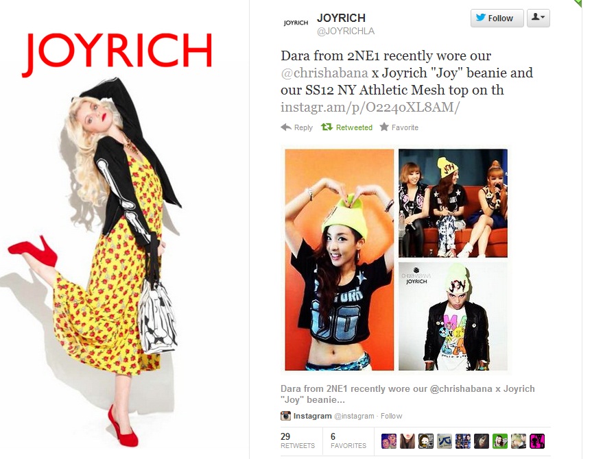 Twitter/Photo: Joyrich LA – “Dara from 2NE1 recently wore our beanie and mesh top”