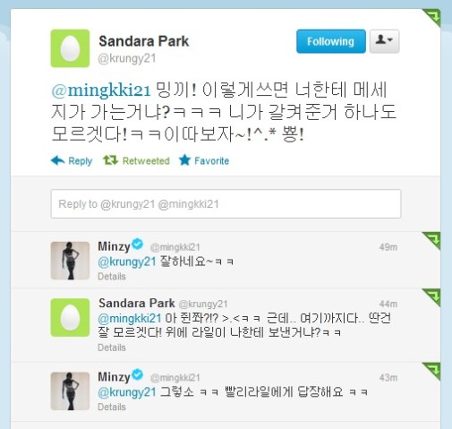 Dara and Mingkki! The fake and real maknae showing some love on Twitter~! So cute how Mingkki helps her unnie! And Dara being all confused on Twitter is just the most adorable thing in the whole wide world!