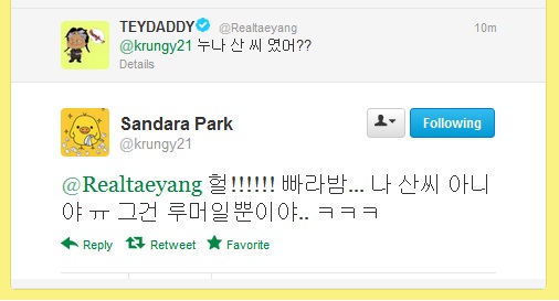 Twitter: Taeyang Asks Dara: “Is Your Name San-Shi?” Dara: HEOL!