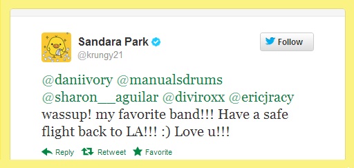 Awww, Dara showing some love to the awesome band.. ^^ Have a safe flight everyone!