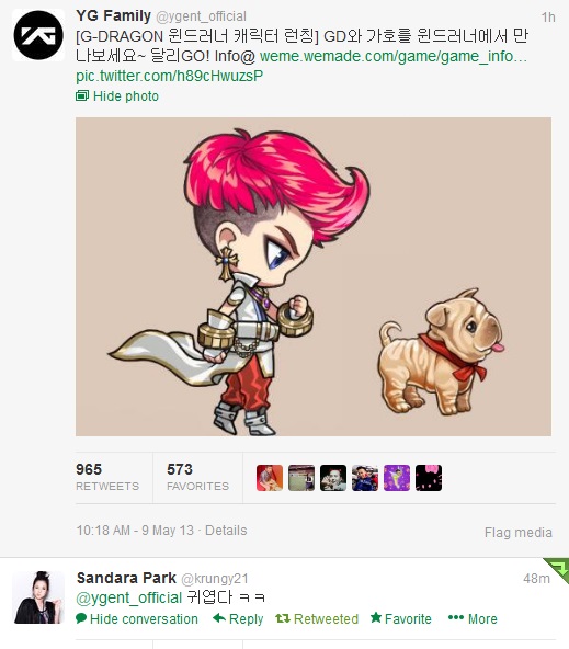 Twitter: Dara Thinks that G-Dragon and Gaho’s WindRunner Characters are “Cute!”