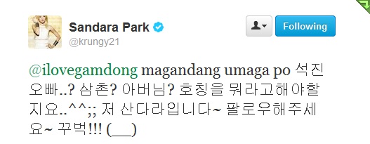 On ep 26 of running man and one of the guests open up about listening to filipino old song and he mentionedAnak an he sang it ànd auk jin oppa followed suit and sang it better…. So yeah thats probably why Sandara greeted him in tagalog.