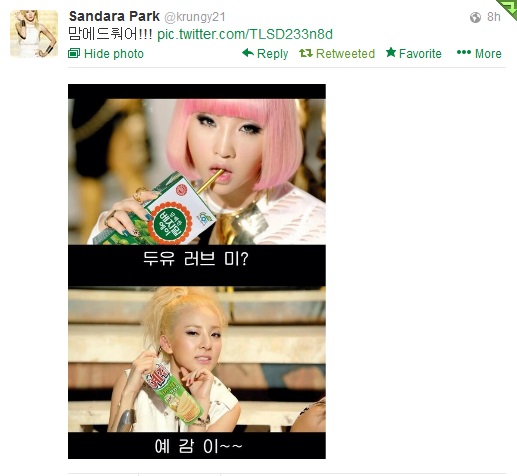 MInzy’s Caption says “두유 러브 미” for “Do you love me” but “두유” can mean soymilk. Minzy is holding soy milk carton! Haha!