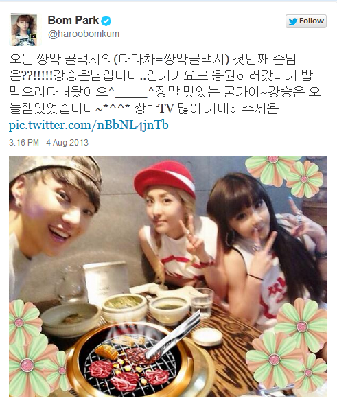 Twitter/Photo: Bom (@Haroobomkum) “The first guest to ride Ssang Park call taxi is…”