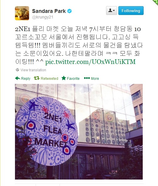 2NE1 flea market will be be happening today, at 7:00 PM, at Cheongdam-dong 10 Corso Como, Seoul. Go go go get the must-get-items, must-get-items!!! There’s even a rumor going on that even the members themselves want some of the items. They told me to sell it to them ㅋㅋ Fighting!!! ^^