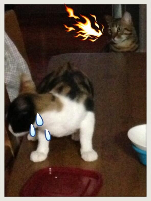 Impulsive younger sister Bambi has taken all of Dadoong-oppa’s things, from his toys, cat towers, to his bed..  And recently, she’s even finished off Dadoongie’s food quietly ㅋㅋ Dadoongie didn’t even show his anger, but just stared at her with this expression on his face.. Very good^^;