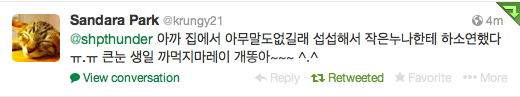 DARA: You didn’t say anything earlier at home so I was sad and told little noona about it ㅠ.ㅠ Don’t forget Big noona’s birthday Gaeddong-ah~~~^.^