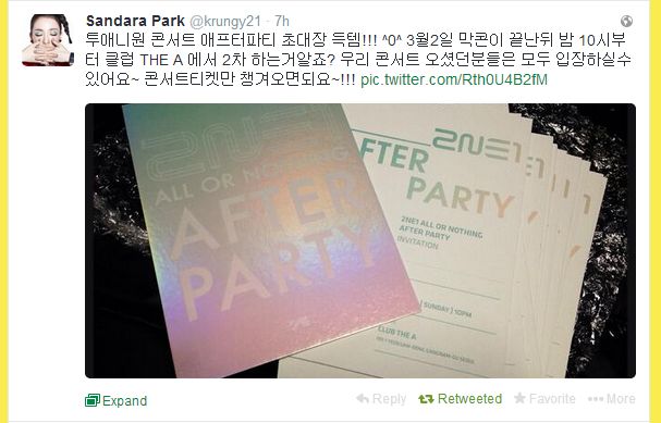 Got the invitations for 2NE1 Concert After Party!!! ^0^ You know that there is a 2nd party on March 2 after the concert starting from 10 o’clock night at THE A club right? Those who attend our concerts can go in~ Just bring the tickets~!!!