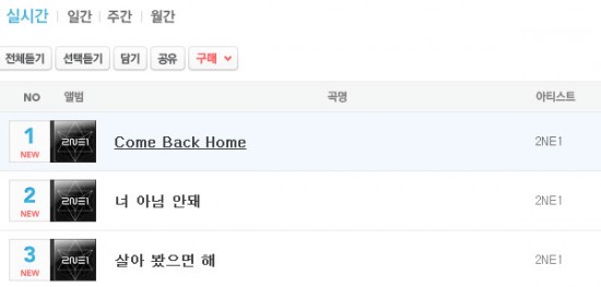 The ladies of 2NE1 have achieved an all-kill for their song “Come Back Home,” as it sits on top of all of the main charts such as Daum, MelOn, Olleh, Naver, Mnet, Cyworld, Genie, Soribada, and Bugs. Congratulations to 2NE1 on this rapid achievement. Make sure you check out their new album if you haven’t already!