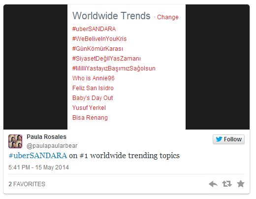 During her guesting for the afternoon recap show of the reality television show, the official hashtag #uberSANDARA topped worldwide trends.