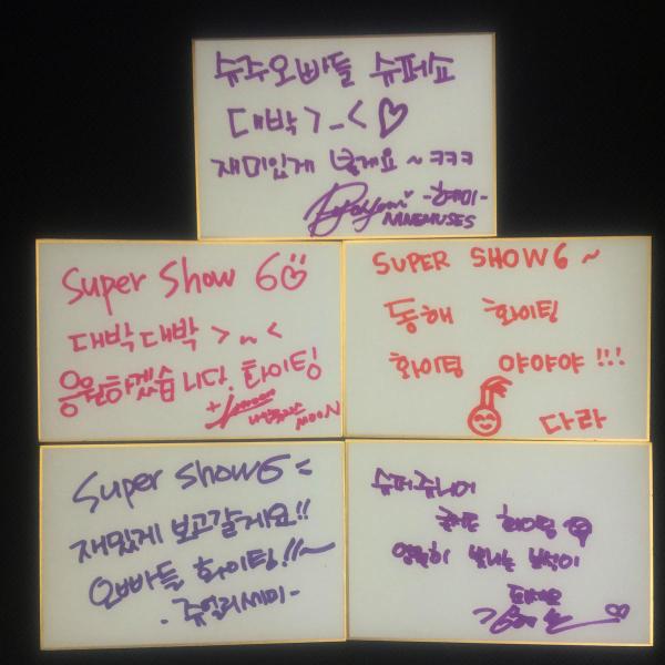 Ooohhh, so SM’s website updated with a photo of messages from the different artists and singers who went to Super Show 6! Dara’s is the one in orange ink, isn’t it cute? Kekeke! With the cute palm tree hair drawing that has become her trademark.. XD