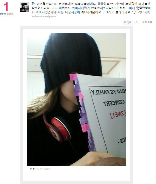 jjan! what is this~?~?!?these are the songs we’re going to sing in the concert. I am daring, am i ! we cant just show you our usual performance can we! and also this is yg’s family concert too~? hehe there are just a few days till the concert so were doing last minute practice! everyone’s dark circle are ~hwak coming out TT but im still excited…^_^ kyak!
