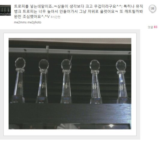 Of course we put in out trophies.. ke our awards are bigger and heavier than i thought ^^; Especially since our Music Bank trophy was so tall, it wouldn’t fit so we just put it on the top ke I was scared I would break it again so I was super careful^.^V