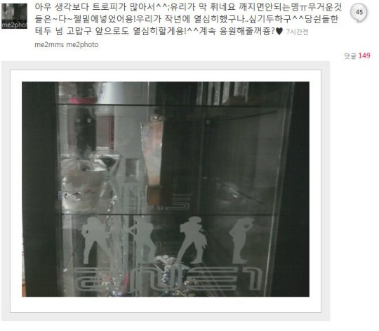 Wow there’s a lot more trophies than I thought^^; The glass is shaking, but we’ll be in trouble if it breaksㅠ We put~all~the heavy ones at the very bottom! Seems we worked really hard last year..I’d like to think so^^ We’re really thankful to you guys, too, and I’ll work hard in the future as well!^^ Will you keep on supporting us?♥