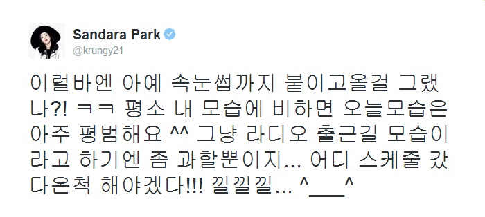 I apologize for the late post of the trans. T_T Weekends are extremely busy for me, so I catch up as much as I can on Sunday evening until Monday. T_T Anyways, here’s Dara’s fun recording for Saturday night! ❤ This wasn’t a live radio, it was pre-recorded on Friday evening. ^^