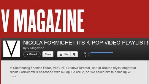 “Our new VJ Chris Kutleta is here to introduce V Contributing Fashion Editor Nicola Formichetti’s playlist of his favorite K-Pop and J-Pop videos! If you follow Nicola on Twitter or Tumblr, then you know he has been in a K-Pop mood this spring. See why with videos from BIG BANG, 2NE1, and many many more! ”