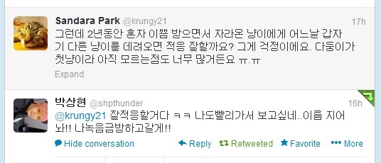 DARA: But I wonder if a cat would adapt well to having another cat with him all of a sudden, after two years of being loved all by himself? I’m quite worried. Because he was alone. Dadoongie doesn’t know much about cats ㅠ.ㅠ