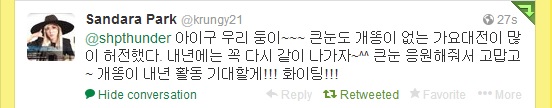 Aigoo doong-ie~Noona felt a lot of emptiness too on Gayo Daejun without you. Lets come out togther next year! Thank you for supporting noona~ And i’ll look forward to ggaeddong’s activities next year!!! Fighting!!!