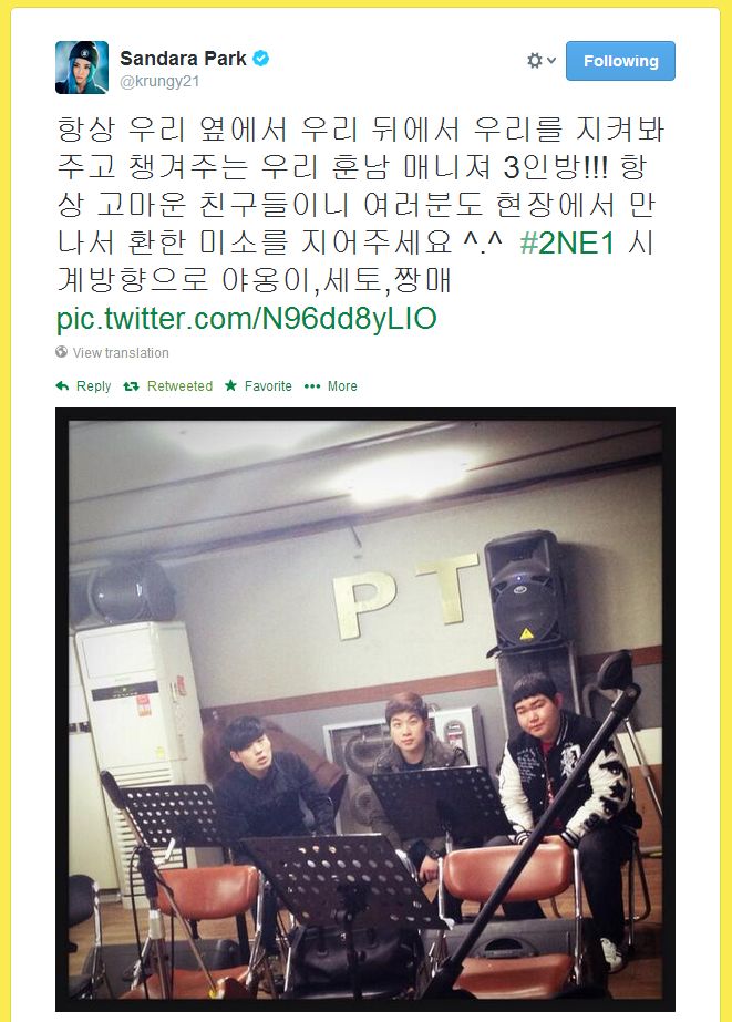Our 3 handsome managers who always watch us and care for us from beside us and behind us!!! They are forever grateful friends, so whenever you see them on site, smile for them ^.^ #2NE1