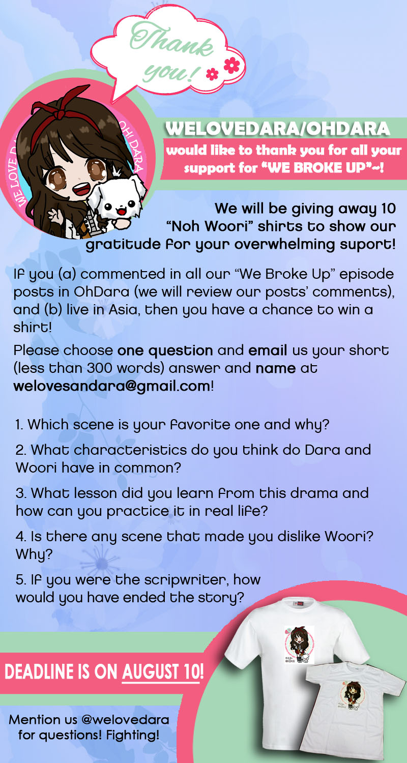 In gratitude for your overwhelming support for “We Broke Up,” WLD/OD will have a small “thank you” project! Get a chance to win a Woori shirt! Here’s how: